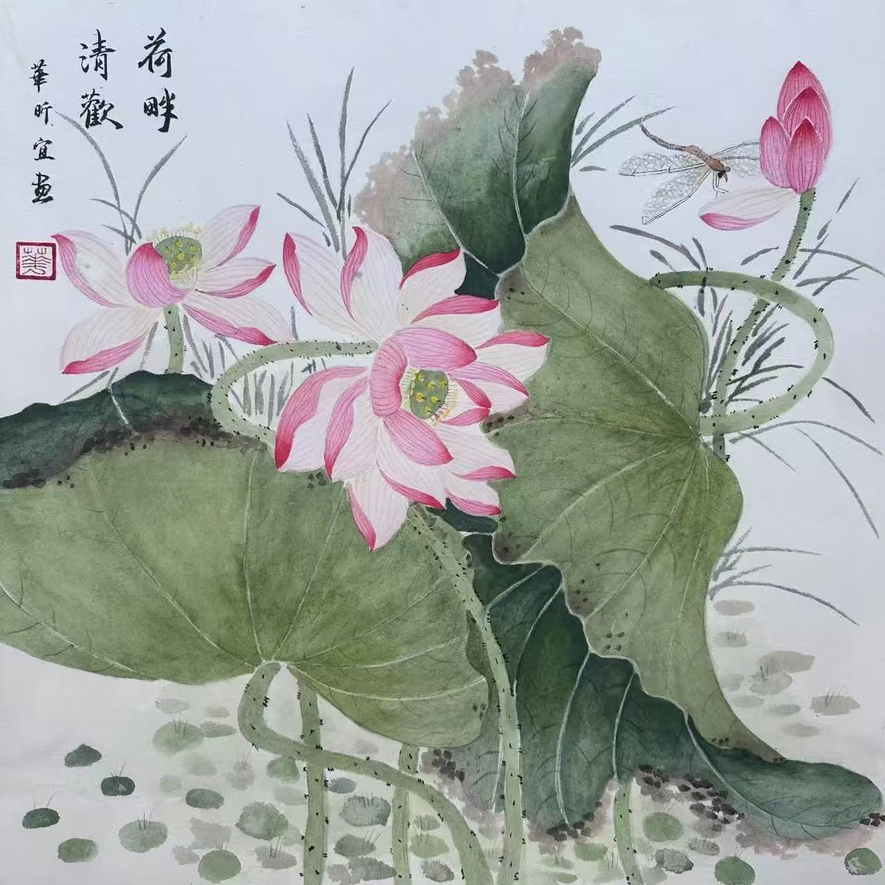 大家好,我是华昕宜。这里为大家呈现的是五幅风格各异的国画佳作。《玉兰双鹊映春昭》以工笔技法勾勒玉兰与鹊鸟,传递春日生机;《紫鸢逸韵》绘鸢尾花,寄寓优雅与希望。《荷畔清欢》融合工笔重彩与没骨法,尽显荷塘清幽。《秋山幽韵》以皴法、点染等技法,展现秋山绚烂与幽静。《鱼影弄翠》将工笔与水墨晕染结合,描绘金鱼、紫藤等,展现自然和谐之美。每幅画都凝聚了我大量的心血,再展现传统国画技艺与魅力的同时,期望他们所传达的意境也能得到大家的共鸣。 Here, we present five outstanding traditional Chinese paintings with diverse styles. In "Magnolias and Two Magpies Reflect the Spring Glory", meticulous brushwork is used to outline the magnolias and magpies, conveying the vitality of spring. "The Elegance of Irises" depicts irises, embodying elegance and hope. "Joy by the Lotus Pond" combines meticulous heavy-color brushwork and the boneless painting method, fully showcasing the tranquility of the lotus pond. "The Profound Rhythm of Autumn Mountains" uses techniques like chiseling strokes and dotting to display the splendor and serenity of the autumn mountains. "Fish Shadows amidst Greenery" combines meticulous brushwork with ink wash, depicting goldfish, wisteria, etc., presenting the beauty of natural harmony. Each painting has taken a great deal of my effort. While presenting the techniques and charm of traditional Chinese paintings, I hope that the artistic conceptions they convey can resonate with everyone.