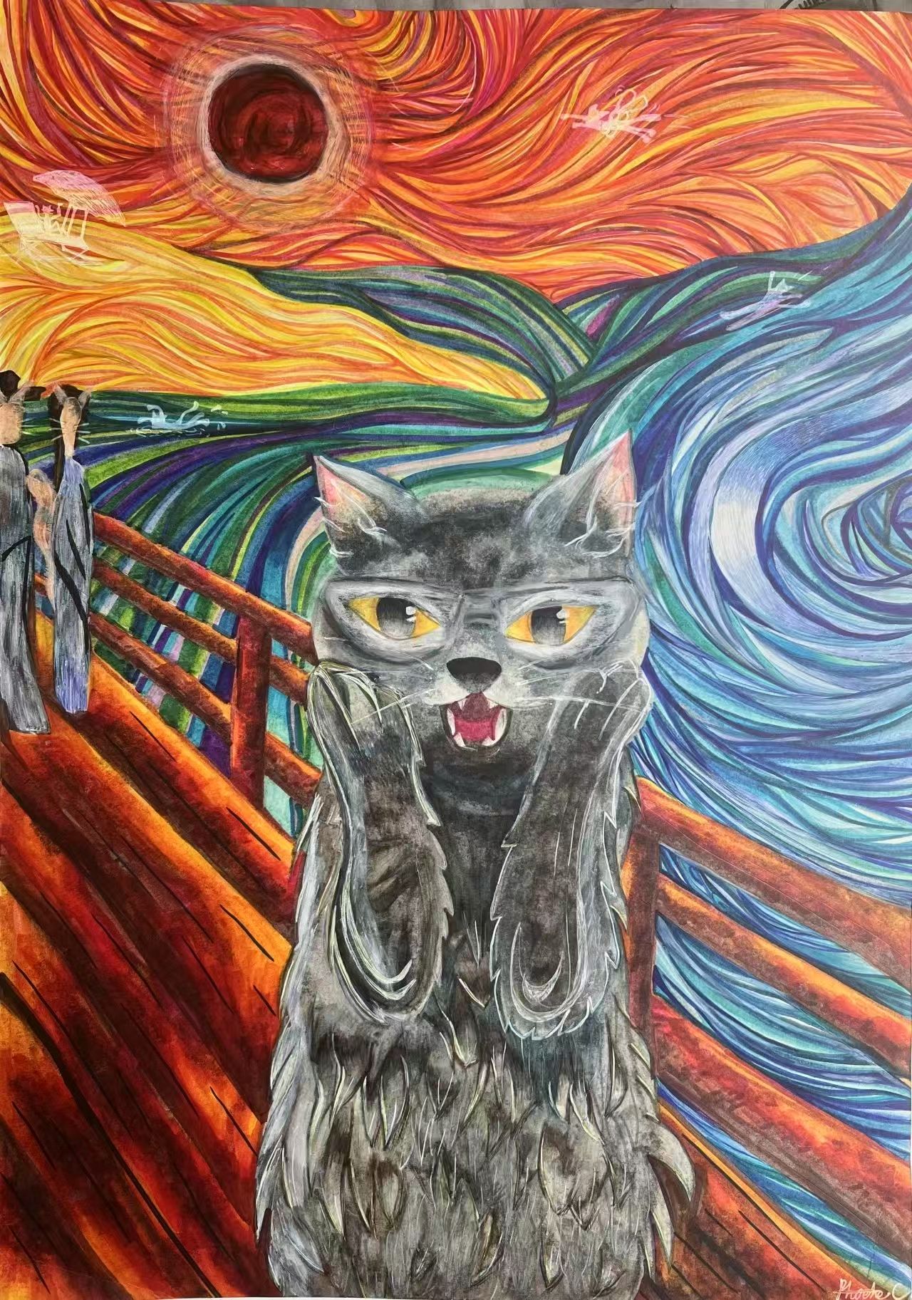 Today, I am honored to show you my work here. I have prepared a total of six pictures, each of which is related to cute, energetic cats. I chose this theme because I have been fond of cats since I was a child, but I have never raised one. Moreover, last summer vacation, I saw an art exhibition about "Universe, Sun, Space Cat" in Tokyo, Japan, which was Taro Okamoto's art commemorative exhibition. After being inspired by him, it took me a year to successfully complete my art work. They are: "Happy Family Cats", "Irritable Cat", "Traveling Abroad", "Outer Space Journey", "Ancient Cat", and "The Hiding Cat Who Steals Chocolate". These works tell such a story: a group of cats from plain life - to surprising trip- to finally finding their hometowns (Asia and Europe). They represent two different cultural integrations of the East and the West; they also describe the different emotions and actions of cats, showing their innocent, clever personalities.I used Markers to draw overall, but sometimes I used Munama for decoration. At first it was a little too difficult, but after trying again and again, I successfully completed my works.