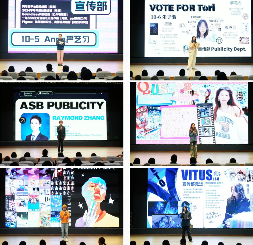 接下来的宣传部竞选也同样精彩,六位同学轮番上阵。他们自 信地介绍了在平面设计、公众号运营、活动摄影及艺术创作等领域的丰富经验,展示了在审美、排版、绘画与展会策划等诸多方面独特的创造力,分享了自己对宣传部的计划。