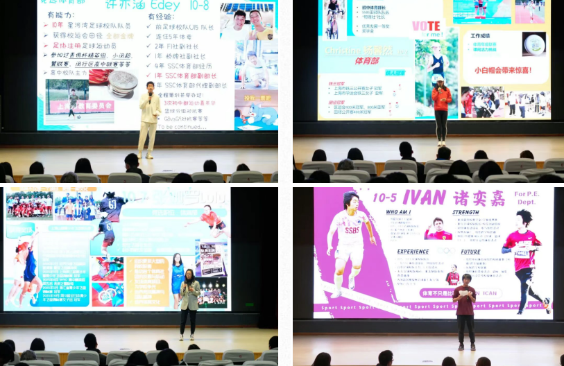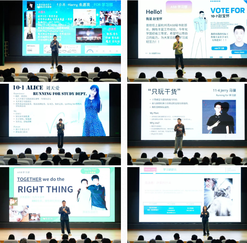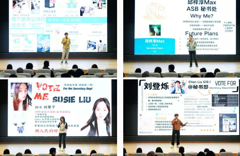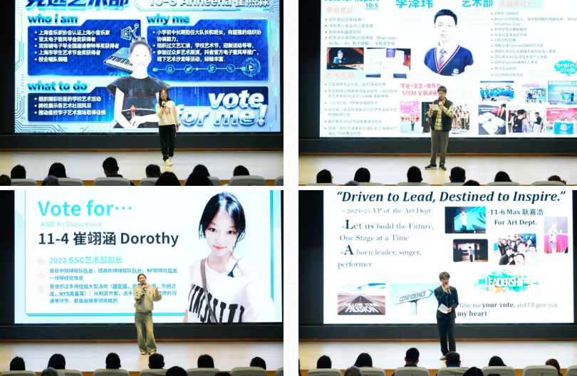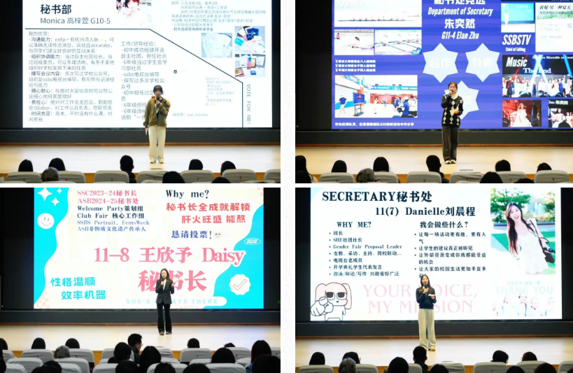 年级代表的四位候选人首先亮相,有的介绍了自己杰出的沟通和策划能力,也有的回顾了在岗位上为服务同学默默付出的努力。他们愿继续奉献,让ASB更好地成为连接每一位同学的桥梁。