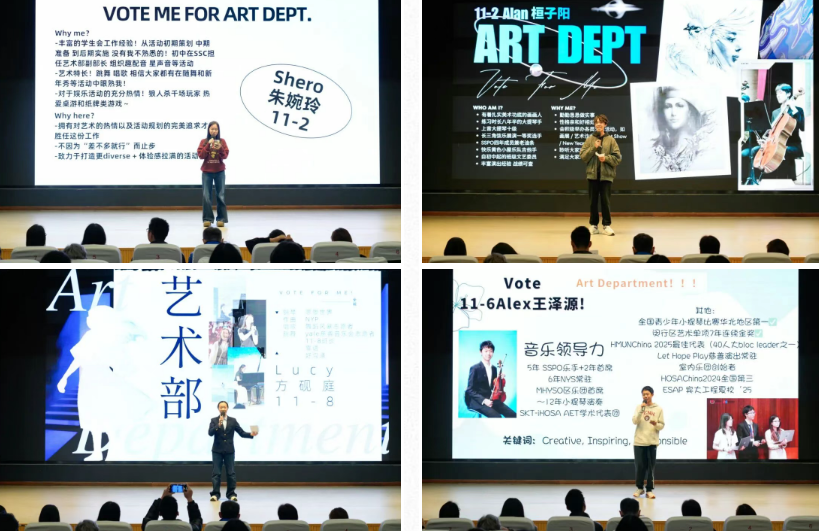 将现场气氛推向高潮的,是今年竞争最为激烈的艺术部。14位才华横溢的候选人同台角逐,展现出了各自多元的艺术风貌。有的同学展示了深厚的摄影、美术功底和艺术展策划经验;有的同学展现了自己在导演、参演音乐剧过程中锤炼出的领导力与责任感;更有的候选人分享了运营社交媒体的独特心得,让他们理解了艺术在新时代的传播力。从声乐、作曲到钢琴、舞蹈,从台前表演到幕后编剧,他们多元的才华与热情,无疑将为ASB注入全新的活力与无限可能。