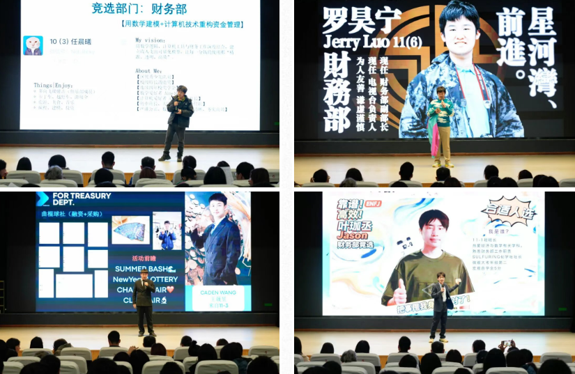 紧接着,八位财务部候选人展现了管理能力与担当。他们不仅具备经济学知识和采购融资能力,更怀揣着为全体同学降本增效的热情。例如有的同学提出,可以用算法模型优化预算,以确保每一笔支出透明高效,将资源精准投入到同学们最需要的地方,实现学生活动效益的最大化。