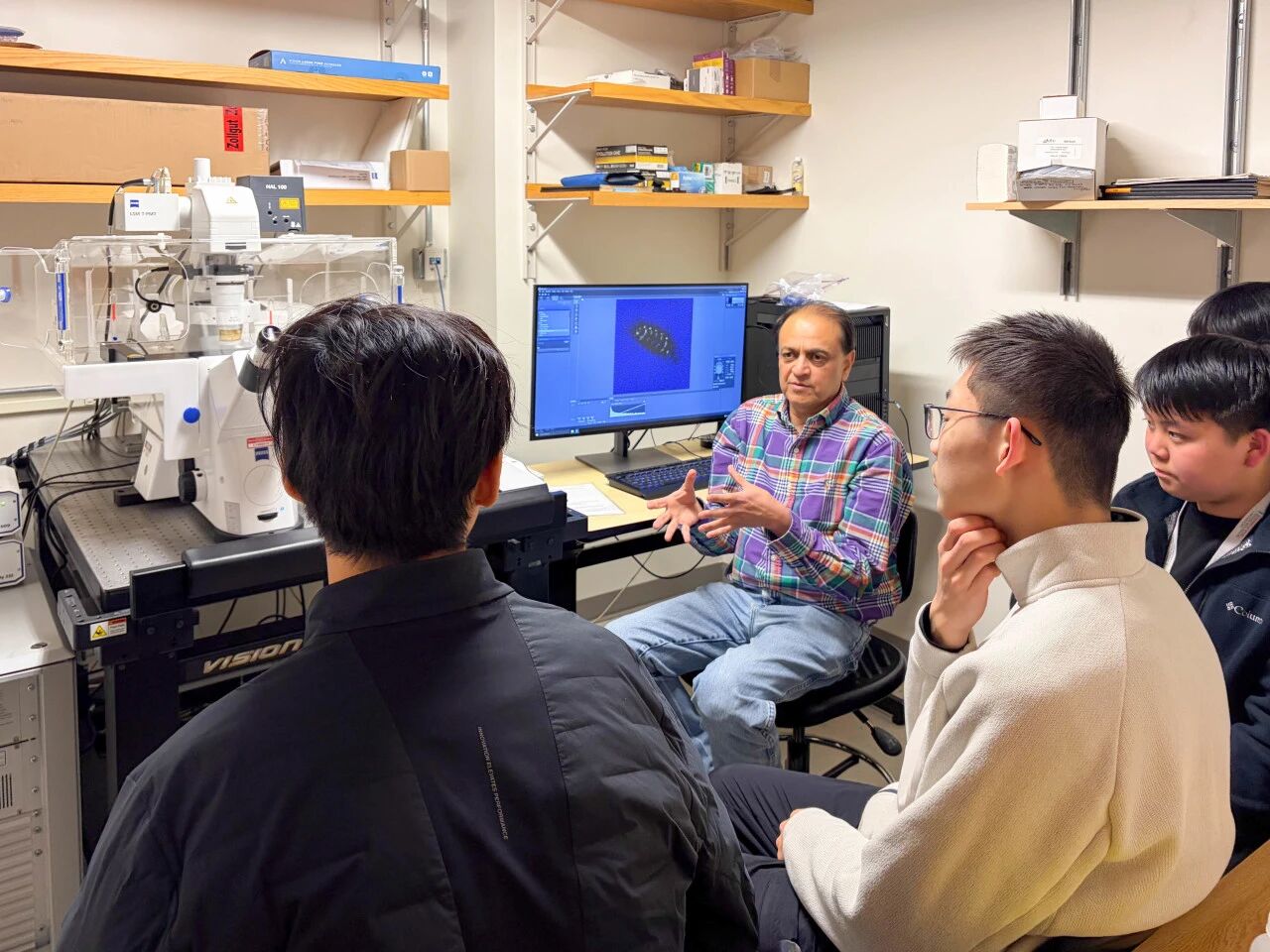 果蝇组在大量透明胚胎中反复甄别不同发育阶段,对特定蛋白进行染色并完成共聚焦成像。长时间的比对与等待,只为获取一张符合科研标准的图像。Dr.Patel对图像质量的严苛要求也让学生们体会到基础科研中,那些不被看见的、重复性工作的重要性。