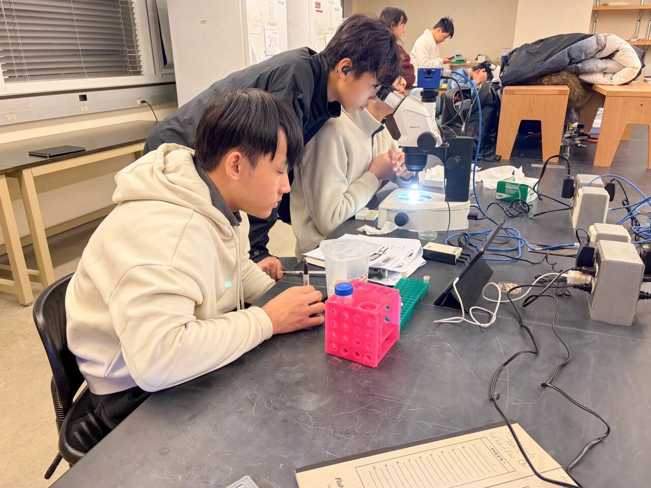 斑马鱼组则在实验设计与操作中不断遭遇挑战。变量浓度的设定、胚胎计数与染色过程中的细微失误,曾导致整批样本损失。然而,在 Dr. Echeverri 连续数日的细致指导下,学生们最终获得了清晰而具有研究意义的成像结果。过程中经历的“失败”,使科学的严谨性与不确定性变得真实而具体。
