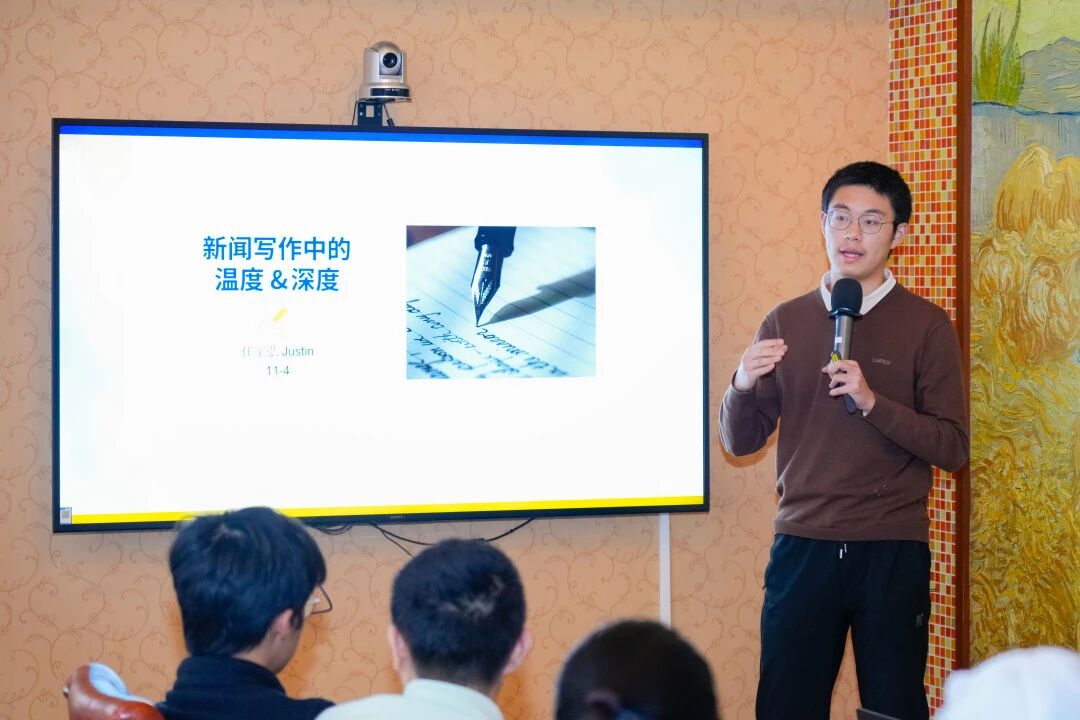 Subsequently, Ren Jiahong from Grade 11 shared his insights on the structural conception and preparation for news manuscripts. In the preparation phase, he recommeded news reporters to first clarify the prominent theme and expected audience, collect and interpret materials concerning the core event, and then build a clear writing framework to avoid chaotic content and ambiguity. He concluded his speech with a quote from Thomas Mann: "A writer is someone for whom writing is more difficult than it is for other people," illustrating that the process of writing is inherently arduous and valuable. He encourages the students to confront these hardships and to continuously refine their skills through practice.