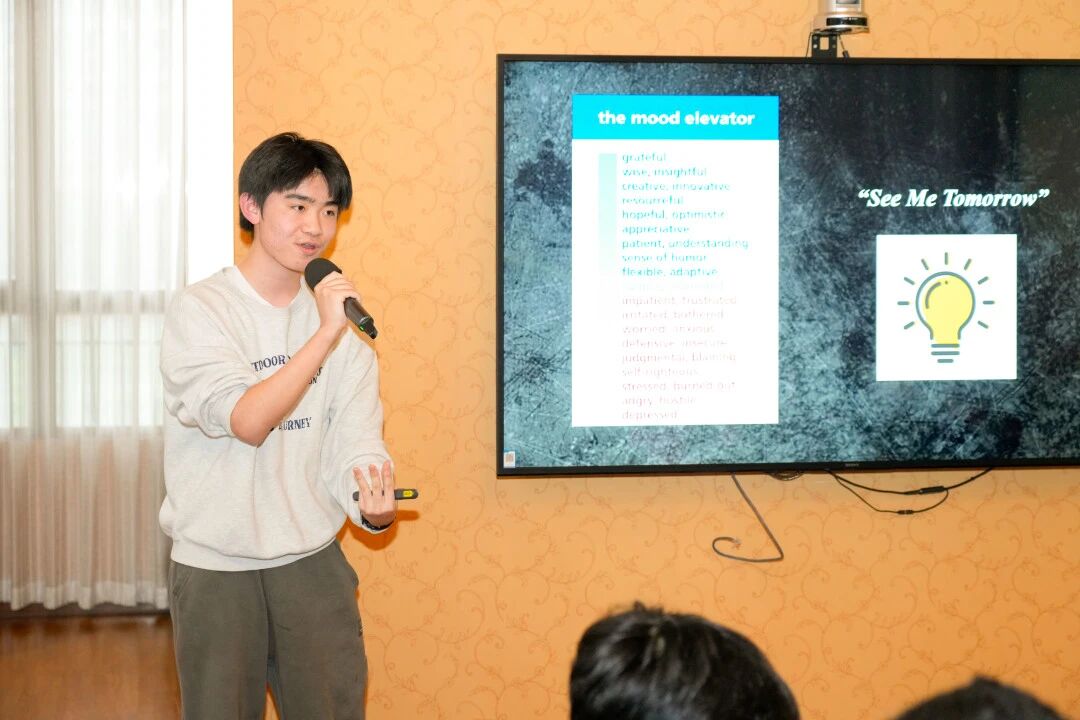 面对传媒工作中可能出现的紧张、焦虑等情绪问题,11-6班的耿嘉浩同学带来了“mood elevator”(情绪电梯)的概念,为在场成员提供了心态调节的新思路。他分享道,mood elevator 的核心在于通过主动调节内心情绪,将负面情绪转化为积极动力。首先,同学们需要识别情绪,如及时察觉自身的紧张、焦虑等,以此提醒自己三思而后行;其次,要勇于接纳负面情绪的产生,正视自身的心理状态;最后,同学们也要主动调节负面情绪,将其转化为好奇心和兴趣。通过耿嘉浩学长的分享,成员们认识到,通过更加积极的自我暗示及快速的心态调整,能更加从容进入工作。