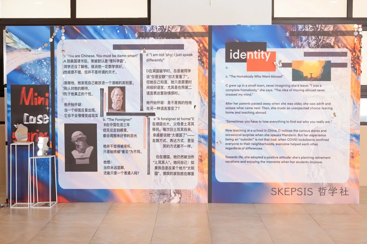 Recently, a philosophy themed exhibition focused on "self identification & cross-cultural" was held in Shanghai Starriver Bilingual School, organized by Jiayan Cao, Qinyuan Cao from 11-7, Ruixin Zhang from 11-3, and all the club members from Skepsis Philosophy club. The exhibition explored how self-identity may shift within different cultural contexts, focusing on a central question: Is self an immutable constant, or a dynamic process reshaped by the turbulence of our surroundings?Exhibition context: How Does Culture Shape Self-Identity?