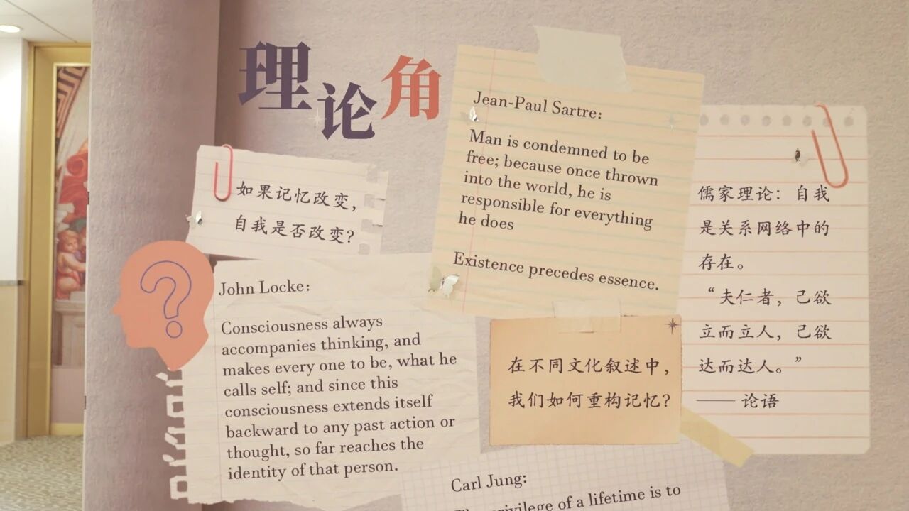 在“Mini Case Stories”展区,策展团队通过一系列基于真实经历改编的个体叙事,生动地呈现了文化跨越对个人认知的深刻冲击。在“理论角”区域,该展览引入了历史上不同哲学家的观点。John Locke 认为,自我是由意识和记忆的连续性组成,而在中国哲学里,儒家则提醒你,自我是在社会网络中构成的。