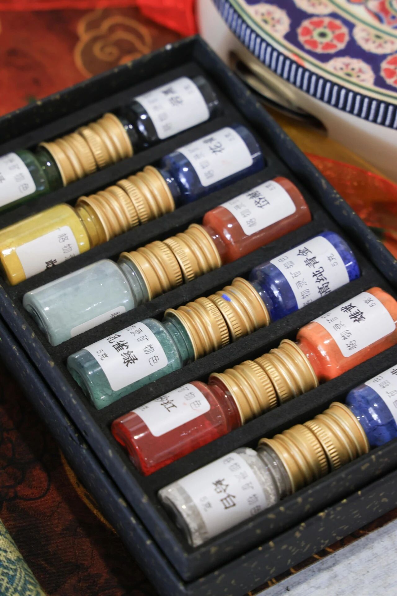 岩彩是源自中国古代壁画的传统绘画技法,以天然矿物原石为核心原料,经研磨、提纯制成不同粗细的矿物颜料。创作时以动物胶为黏合剂,通过多层叠加、厚薄交替的方式上色,形成独特的通透光泽与厚重质感。