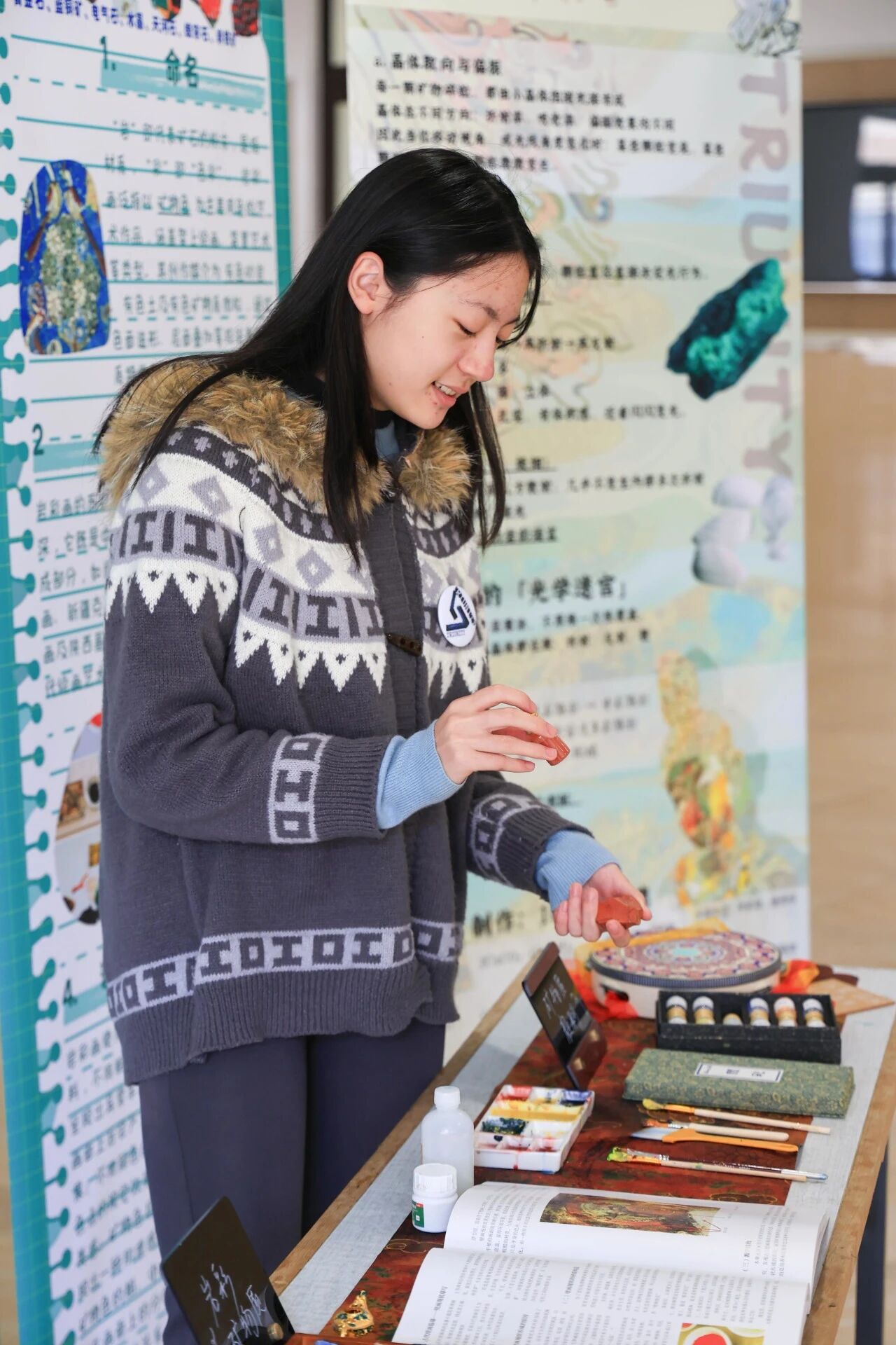 “对我而言,这不仅是一场展览,更是一次将热爱落地的修行。在校园里,从研究岩彩材料,从搭建布景到布置展陈,每一寸空间的呈现,都藏着将念头转化为行动的执着。国风家具承载古韵,同学们以巧手为笔,以创意为墨,将传统岩彩的厚重质感,与当代的审美活力相融。没有华丽的噱头,只有手作的温度与节俭的匠心。愿这份对美的坚守,如岩彩般历经时光,依然熠熠生辉。”